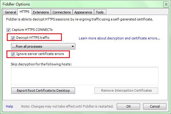 选中"Decrpt HTTPS traffic", Fiddler就可以截获HTTPS请求