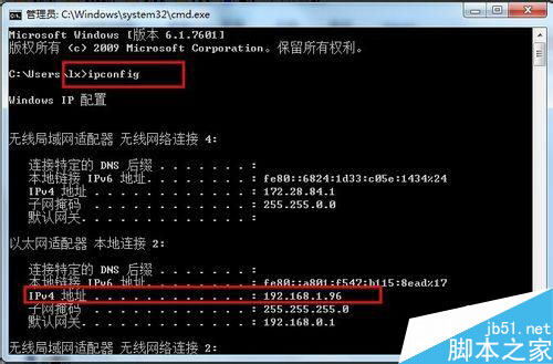首先获取PC的ip地址:命令行中输入:ipconfig,获取ip地址