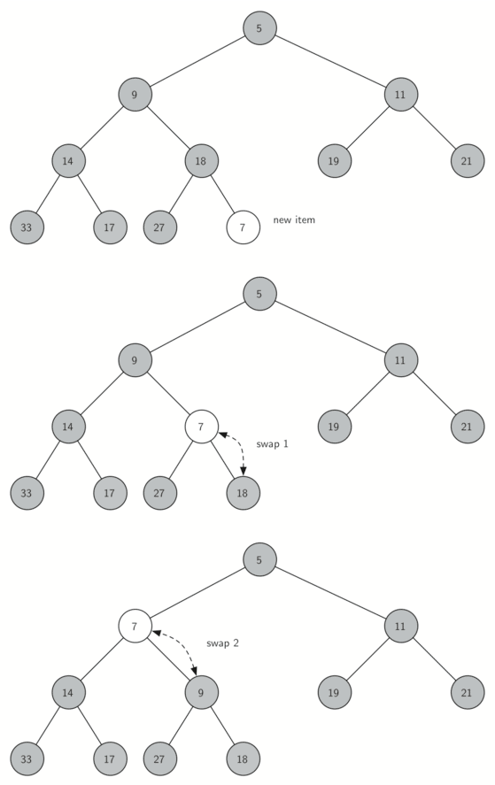 我们接下来要实现的是insert方法。首先,为了满足“完全二叉树”的性质,新键值应该添加到列表的末尾。然而新键值简单地添加在列表末尾,显然无法满足堆次序。但我们可以通过比较父节点和新加入的元素的方法来重新满足堆次序。如果新加入的元素比父节点要小,可以与父节点互换位置。图 3 所示的是一系列交换操作来使新加入元素“上浮”到正确的位置。