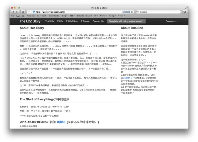 另一个跑在Google App Engine上 地址是 http://l2zstory.appspot.com 在把Django 配置到GAE的时候我花了很多功夫才把框架搭起来