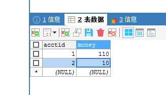 在银行转账系统中,需要考虑如下需求:比如A给B转账,当A账户上减少了M钱时,必须在B账户上多了M钱,不能A减了B没加,也不能B加了A还没有减,当然账户必须是有效的,M钱的金额肯定要大于A账户上的金额。所以在具体设计的时候,需要将A账户的金钱减少和B账户的金钱增加作为一个事务,要么同时成功,要么一起失败。按照这个需求,书写代码,详细代码见github,代码复制和数据库如下,有两个账户,分别拥有金钱110和10,在运行代码的时候在参数栏输入1,2,100(source_acctid, target_acctid, tranfer_money)。