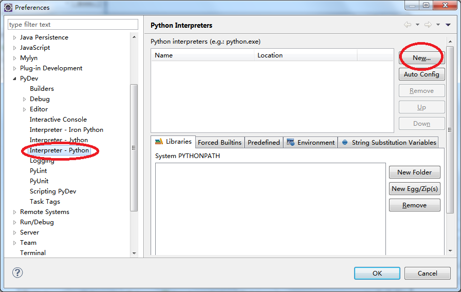4.3 在弹出的对话框中选择PyDev --> Interpreter - Python,点击按钮”New...“