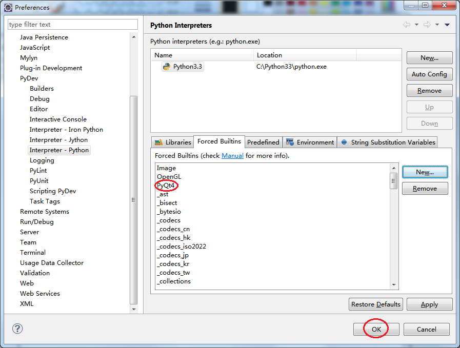 4.8 确定Forced Builtins里有PyQt4后,点OK