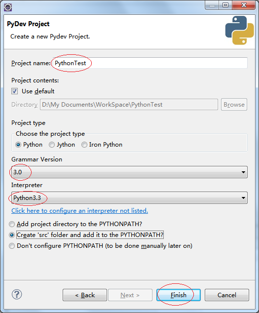 5.3 填入Project Name,选择Grammar Version --> 3.0,选择Interpreter --> Python3.3,点Finish
