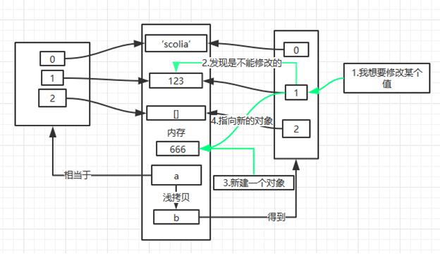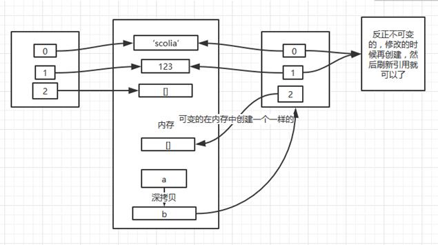 a = ['scolia', 123, [], ] b = a[:] b[1] = 666 print id(a), id(a[0]), id(a[1]), id(a[2]) print id(b), id(b[0]), id(b[1]), id(b[2])