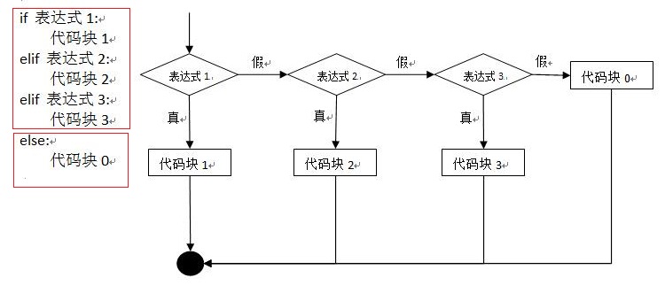 Python中if...else...的扩展模式:多个if条件判断,如下图所示:整个代码块的执行,是顺着某些箭头方向走到结束(图中的黑点)。