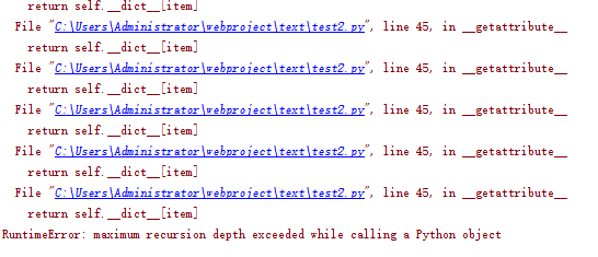 也就是说获取 self.__dict__ 时,会再次调用 __getattribute__ 方法,然后方法内又调用了 self.__dict__ 。这样无限循环下去,最终会抛出一个异常。