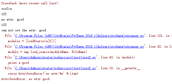 return 'can not set attr: %s' % item # 访问不存在的scolia属性时,打印一句话而不报错