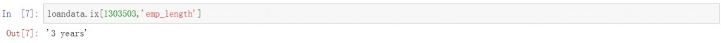 第三步是按行和列提取信息,把前面两部的查询条件放在一起,查询特定用户的特定信息,下面是查询member_id为1303503的用户的emp_length信息。