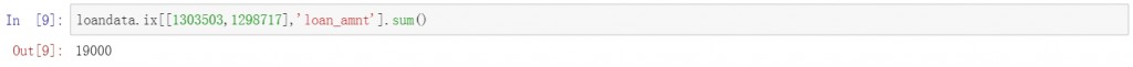 在前面的代码后增加sum函数,对结果进行求和,同样是查询两个特定用户的贷款进行,下面的结果中直接给出了贷款金额的汇总值。