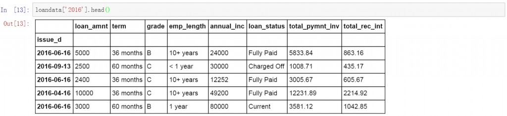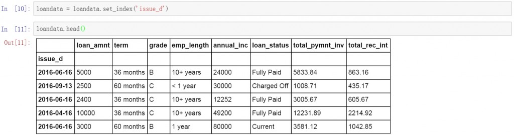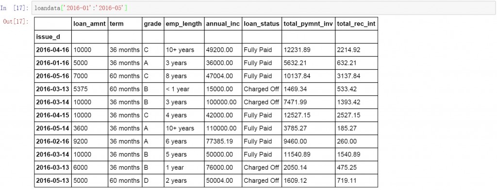 首先将索引字段改为数据表中的日期字段,这里将issue_d设置为数据表的索引字段。按日期进行查询和数据提取。