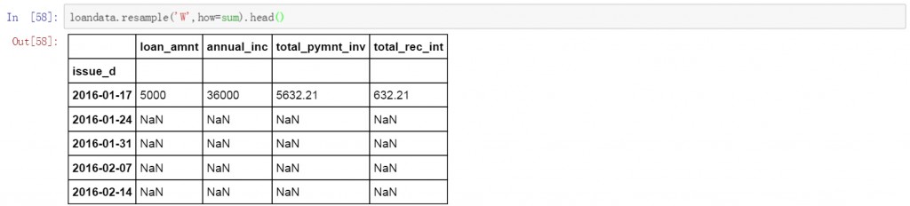 loandata.resample('W',how=sum).head(10)