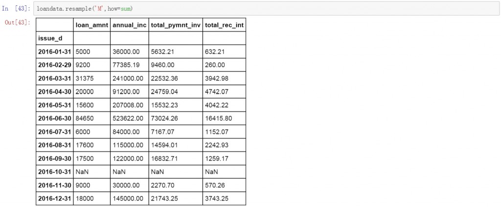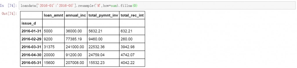loandata['2016-01':'2016-05'].resample('M',how=sum).fillna(0)
