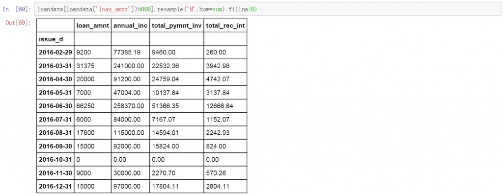 或者只对某些符合条件的数据进行聚合和计算。下面的代码中对于贷款金额大于5000的按月进行聚合,并计算求和。空值以0进行填充。