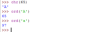 一个字节包括八个比特位,每个比特位表示0或1,一个字节即可表示从00000000到11111111共2^8=256个数字。一个ASCII编码使用一个字节(除去字节的最高位作为作奇偶校验位),ASCII编码实际使用一个字节中的7个比特位来表示字符,共可表示2^7=128个字符。比如ASCII编码中的01000001(即十进制的65)表示字符'A',01000001加上32之后的01100001(即十进制的97)表示字符'a'。现在打开Python,调用chr和ord函数,我们可以看到Python为我们对ASCII编码进行了转换。如图