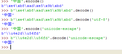 前文说的Python3的默认编码是UTF-8,所以我们可以看到,Python处理这些字符的时候是以UTF-8来处理的。因此从上图可以看到,就算我们通过encode('utf-8')特意把字符encode为UTF-8编码,出来的结果还是相同:b'\xe4\xb8\xad'。