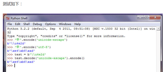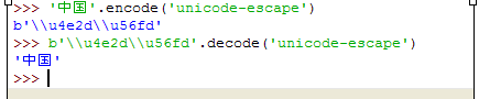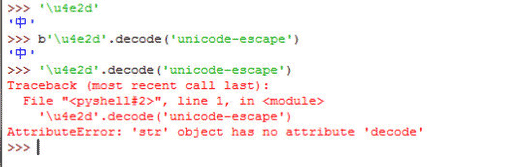 b'\\u4e2d'还是b'\u4e2d,一个斜杠貌似没影响。同时可以 发现在shell窗口中,直接输 '\u4e2d'和输入b '\u4e2d'.decode('unicode-escape')是相同的,都会打印出汉字‘中', 反而是 '\u4e2d'.decode('unicode-escape')会报错。说明 说明Python3不仅支持Unicode,而且一个‘\uxxxx'格式的 Unicode字符 可被辨识且被等价于str类型。