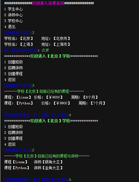 course_name = input("\33[34;0m输入讲师【%s】要授课的课程\33[0m:"%teacher_name).strip()