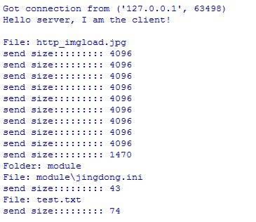 Server在收到Client的某个信号之后(此代码中,当Client随便向Server发送任何内容都可),Server即会调用send_file_folder将sever文件夹下的内容全部发送给客户端。