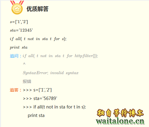 #!/usr/bin/env python # -*- coding: gbk -*- # -*- coding: utf_8 -*- # Date: 2016/5/13 # Created by 独自等待 # 博客 http://www.waitalone.cn/ filters = ['招聘', '诚聘', '社招'] contents = [ '独自等待安全团队诚聘, https://www.jb51.net/', '独自等待安全团队招聘, https://www.jb51.net/', '独自等待安全团队社招, https://www.jb51.net/', '独自等待信息安全博客, https://www.jb51.net/', ] for content in contents: if any(keyword in content for keyword in filters): continue print content