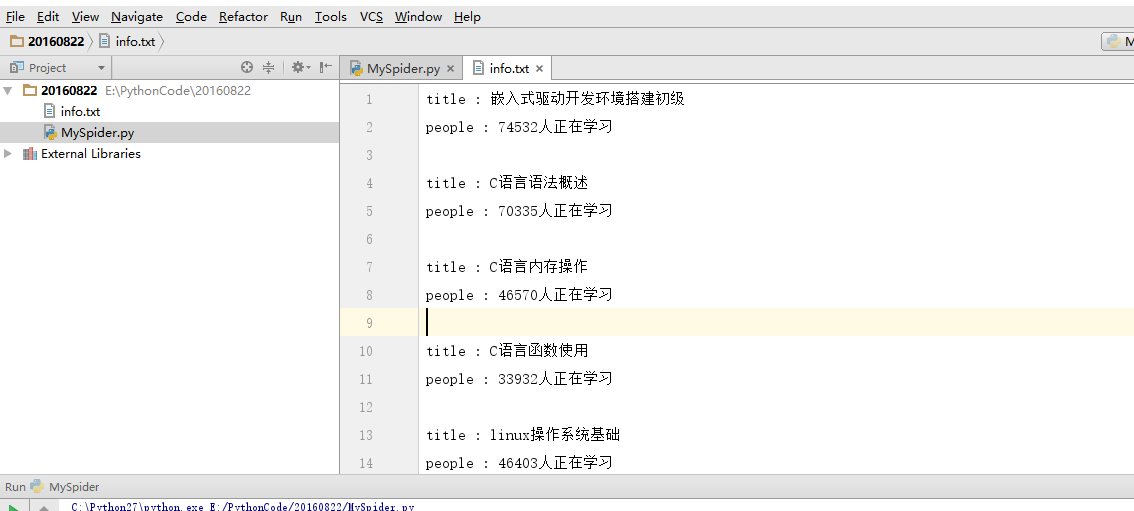 以上代码并不难懂,基本就是正则表达式的使用,然后直接运行就可以看到开头我们的截图内容了,由于这是单线程爬虫,所以运行速度感觉有点慢,接下来还会继续更新多线程爬虫。