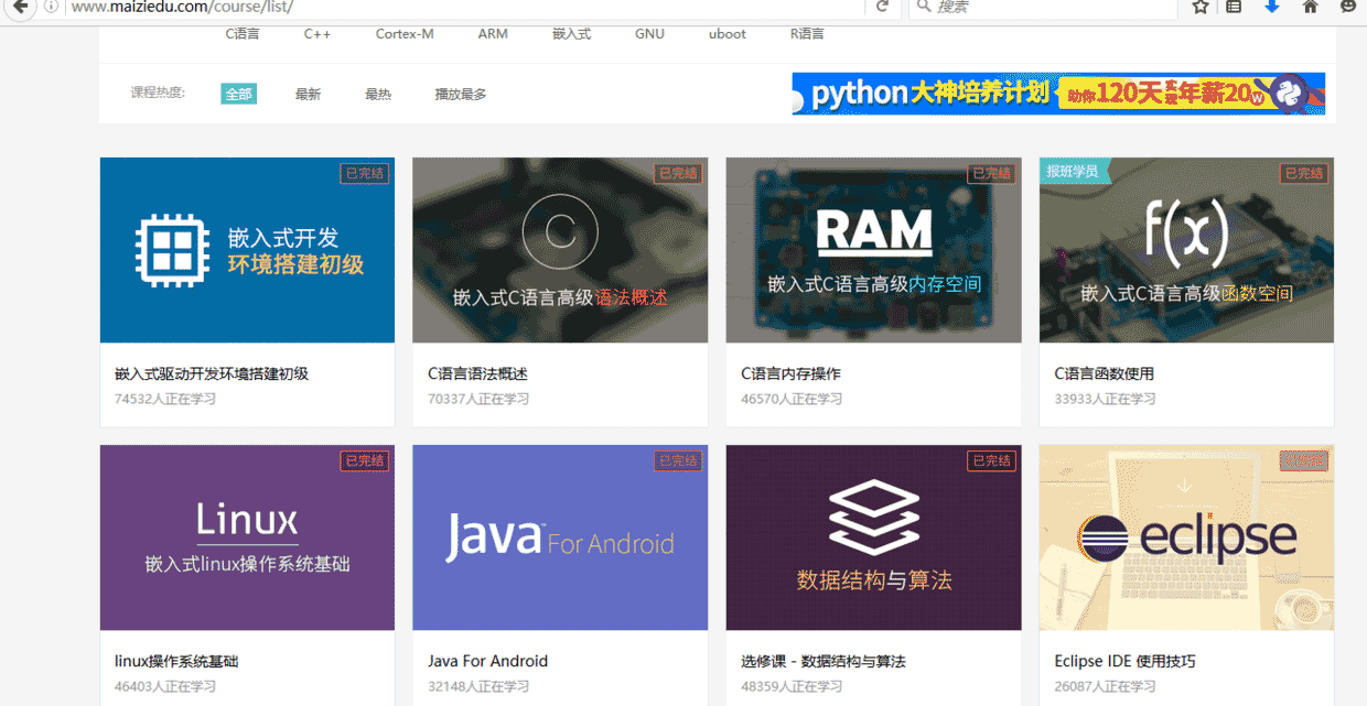 怎么样,是不是已经跃跃欲试了?首先让我们打开麦子学院的网址,然后找到麦子学院的全部课程信息,像下面这样