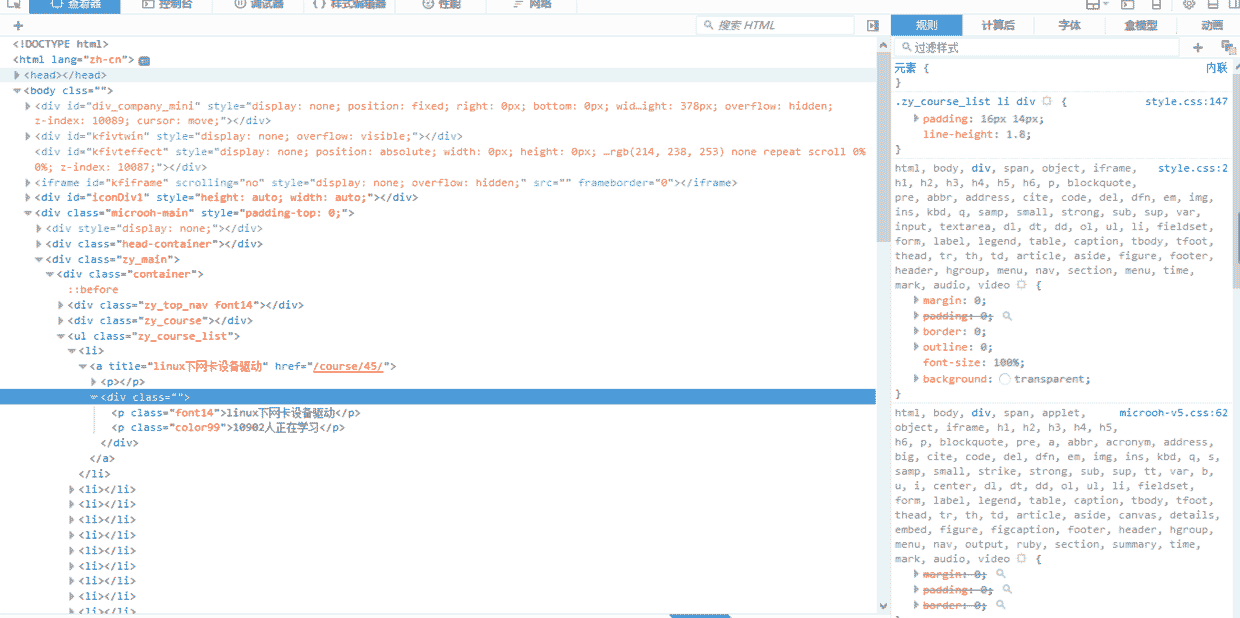 这个时候进行翻页,观看网址的变化,首先,第一页的网址是 http://www.maiziedu.com/course/list/, 第二页变成了 http://www.maiziedu.com/course/list/all-all/0-2/, 第三页变成了 http://www.maiziedu.com/course/list/all-all/0-3/ ,可以看到,每次翻一页,0后面的数字就会递增1,然后就有人会想到了,拿第一页呢?我们尝试着将 http://www.maiziedu.com/course/list/all-all/0-1/ 放进浏览器的地址栏,发现可以打开第一栏,那就好办了,我们只需要使用 re.sub() 就可以很轻松的获取到任何一页的内容。获取到网址链接之后,下面要做的就是获取网页的源代码,首先右击查看审查或者是检查元素,就可以看到以下界面