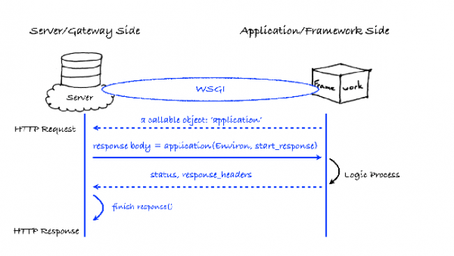 应用程序(网络框架)提供一个命名为application的可调用对象(WSGI协议并没有指定如何实现这个对象)。 服务器每次从HTTP客户端接收请求之后,调用可调用对象application,调用时传递一个名叫environ的字典作为参数,以及一个名为start_response的可调用对象。 框架/应用生成HTTP状态码以及HTTP响应报头,然后将二者传递至start_response,等待服务器保存。此外,框架/应用还将返回响应的正文。 服务器将状态码、响应报头和响应正文组合成HTTP响应,并返回给客户端(这一步并不属于WSGI协议)。