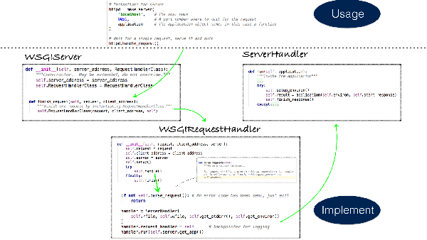 这里主要有三个类,WSGIServer,WSGIRequestHandler,ServerHandle。WSGIServer 是Web服务器类,可以提供server_address(IP:Port)和 WSGIRequestHandler 类来进行初始化获得一个server对象。该对象监听响应的端口,收到HTTP请求后通过 finish_request 创建一个RequestHandler 类的实例,在该实例的初始化过程中会生成一个 Handle 类实例,然后调用其 run(application) 函数,在该函数里面再调用应用程序提供的 application对象来生成响应。