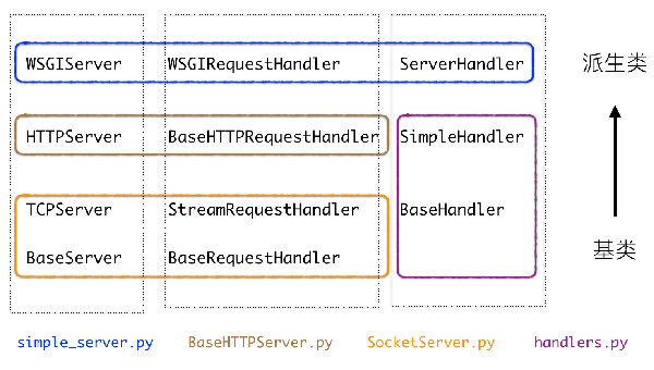 其中 TCPServer 使用 socket 来完成 TCP 通信,HTTPServer 则是用来做 HTTP 层面的处理。同样的,StreamRequestHandler 来处理 stream socket,BaseHTTPRequestHandler 则是用来处理 HTTP 层面的内容,这部分和 WSGI 接口关系不大,更多的是 Web 服务器的具体实现,可以忽略。