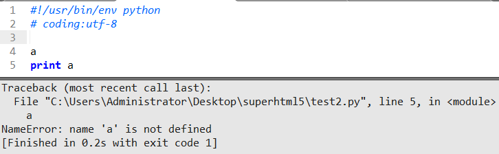 NameError 命名错误 原因是: name 'a' is not defined 命名a还未定义 简单来说就是程序不知道a带表谁 如果a=1 那程序就懂了 a代表1
