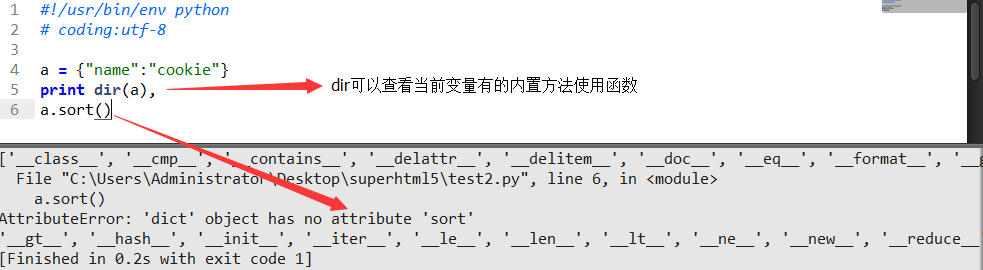 AttributeError 成员属性错误 原因:一切皆对象 然而字典a对象内没有一个内置函数也就是内置方法叫sort排序,大家都知道字典是无序的,list列表才有这方法