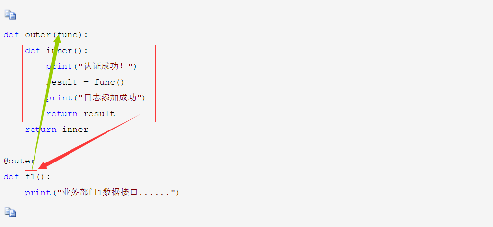 6.接下来,还没有结束。当业务部门,依然通过f1()的方式调用f1函数时,执行的就不再是老的f1函数的代码,而是inner函数的代码。在本例中,它首先会打印个“认证成功”的提示,很显然你可以换成任意的代码,这只是个示例;然后,它会执行func函数并将返回值赋值个变量result,这个func函数就是老的f1函数;接着,它又打印了“日志保存”的提示,这也只是个示例,可以换成任何你想要的;最后返回result这个变量。我们在业务部门的代码上可以用 r = f1()的方式接受result的值。