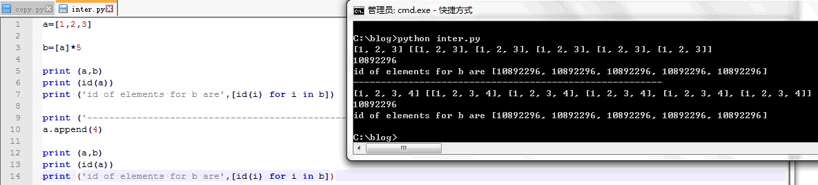 之后,我们对a进行了append操作,由于list是一个可变对象,所以,他的内存地址并没有改变,但是,对于内存中这个地址的引用的所有对象,都会被一同改变可以从上面测试图分割线下半部分看出来.