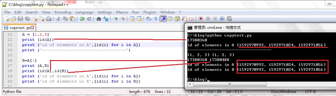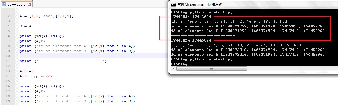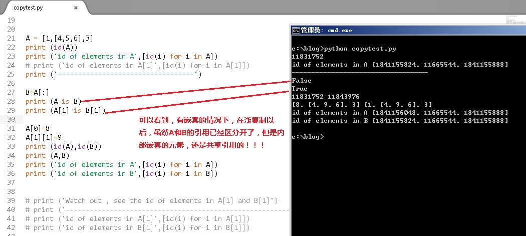 看下面的例子,B通过 B = A[:] 操作,来进行了浅复制,你可以看到,浅复制之后,A和B引用的内存地址已经是不同的了