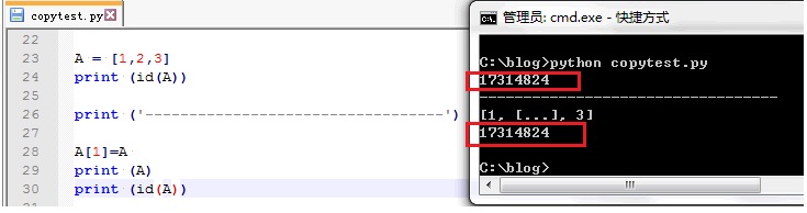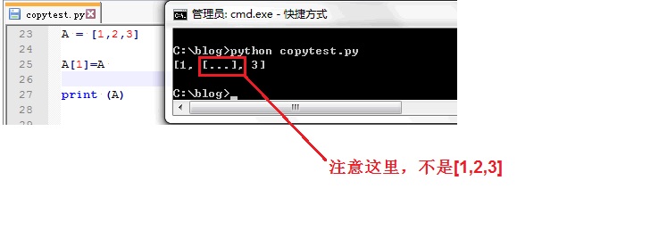 其实是因为,A指向的是[1,2,3]这个列表,在这个例子中,只是把A的第2个元素,指向了A对象本身,所以说,只是A的结构发生了变化!但是,A还是指向那个对象