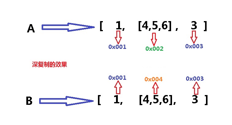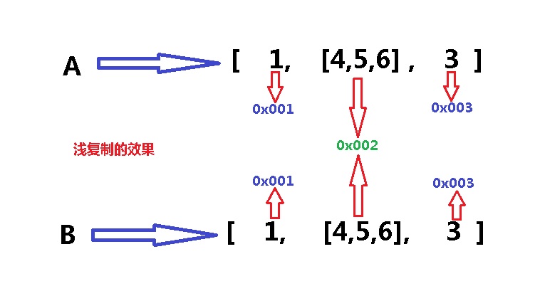 这个[4,5,6]我们可以理解为:A和B还共同引用着,也就是对于A和B的第二个元素来说,他们还是指向同一块内存地址的。