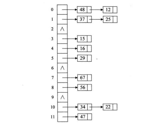 碰到冲突时,不更换地址,而是将所有关键字为同义词的记录存储在一个链表里,在散列表中只存储同义词子表的头指针,如下图: