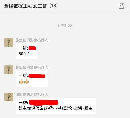最近 全栈数据工程师养成攻略 的微信群已经将近500人,开了二群之后为了打通不同微信群之间的消息,花了点时间做了个消息同步机器人,在任意群收到消息时同步到其他群,并且将聊天内容上传至数据库,以供进一步分析、统计和展示。