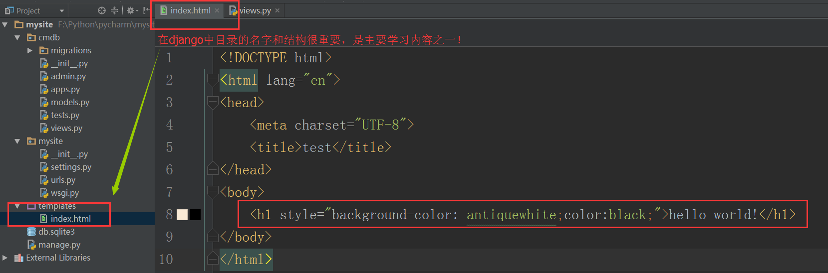 通过上面两个步骤,我们将index这个url指向了views里的index()函数,它接收用户请求,并返回一个“hello world”字符串。
