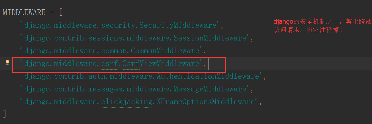 此时 ,重启web服务时,会出错,因为django有一个跨站请求保护机制,我们在settings文件中将它关闭。