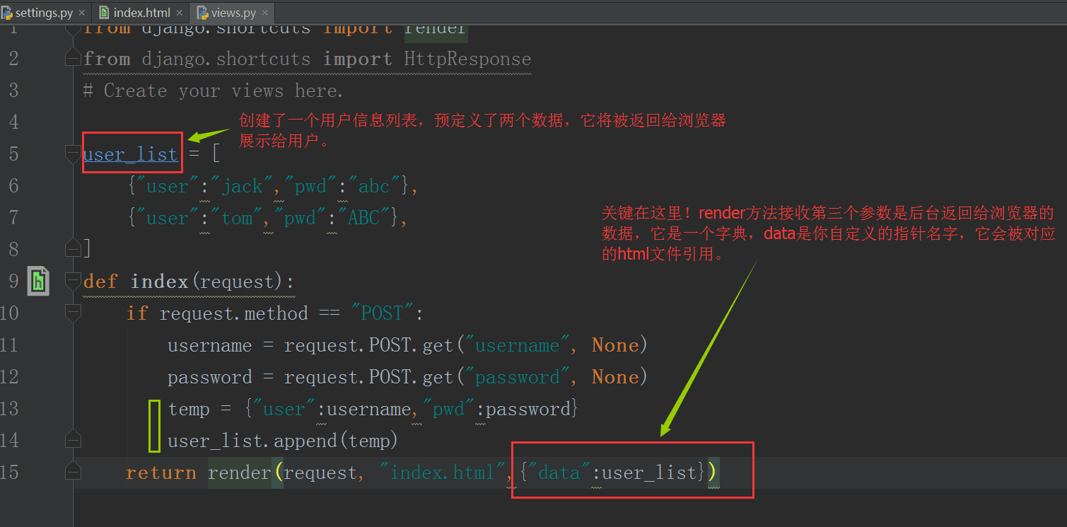 我们收到了用户的数据,但返回给用户的依然是个静态页面,通常我们会根据用户的数据,进行处理后在返回给用户。
