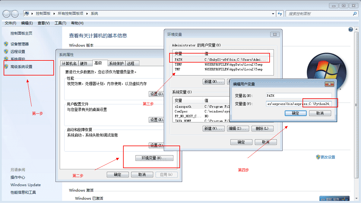 原因很简单,是因为python.exe文件在 Python 目录下,我们还没有设置环境变量。所以我们需要手动添加环境变量:鼠标右键我的电脑 -> 属性 -> 点击高级系统设置 -> 点击环境变量 -> 点击PATH -> 在最后面加上我们的Python安装路径 -> 点击确定。用一张图来表示就是: