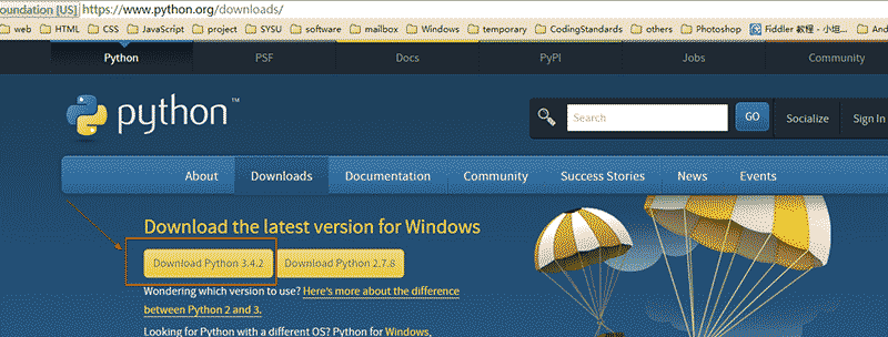 第一步,我们先来安装Python,博主选择的版本是最新的3.4.2版本。windows下面的Python安装一般是通过软件安装包安装而不是命令行,所以我们首先要在Python的官方主页上面下载最新的Python安装包。下载地址是:https://www.python.org/downloads/