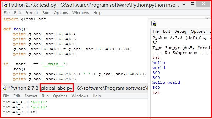 import global_abc def foo(): print global_abc.GLOBAL_A print global_abc.GLOBAL_B print global_abc.GLOBAL_C global_abc.GLOBAL_C = global_abc.GLOBAL_C + 200 print global_abc.GLOBAL_C if __name__ == '__main__': foo() print global_abc.GLOBAL_A + ' ' + global_abc.GLOBAL_B print global_abc.GLOBAL_C 输出如下所示,全局变量结构是可以改变的。 >>> hello world 300 500 hello world 500