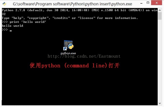 python解释器在Linux中可以内置使用安装,windows中需要去www.python.org官网downloads页面下载(如python-2.7.8.amd64.msi),安装Python集成开发环境(Python Integrated Development Environment,IDLE)即可.运行程序输入">>>print 'hello world'"则python解释器会打印输出"hello world"字符串. 如下: