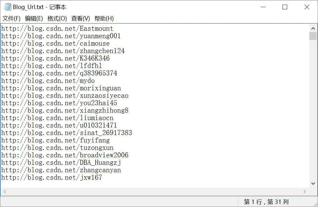在Blog_Url.txt文件中放置需要爬取用户的博客地址URL,如下图所示。注意在此处,作者预先写了个爬取CSDN所有专家的URL代码,这里为访问其他人用于提升阅读量已省略。