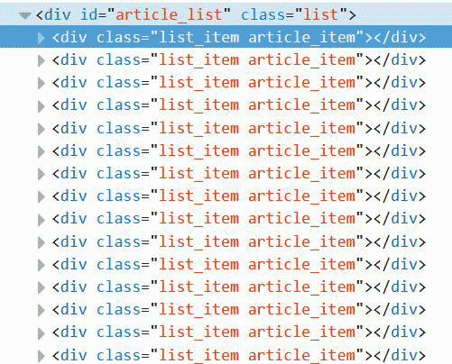 发现每篇文章都是由一个<div></div>组成,如下所示,只需要定位到该位置即可。
