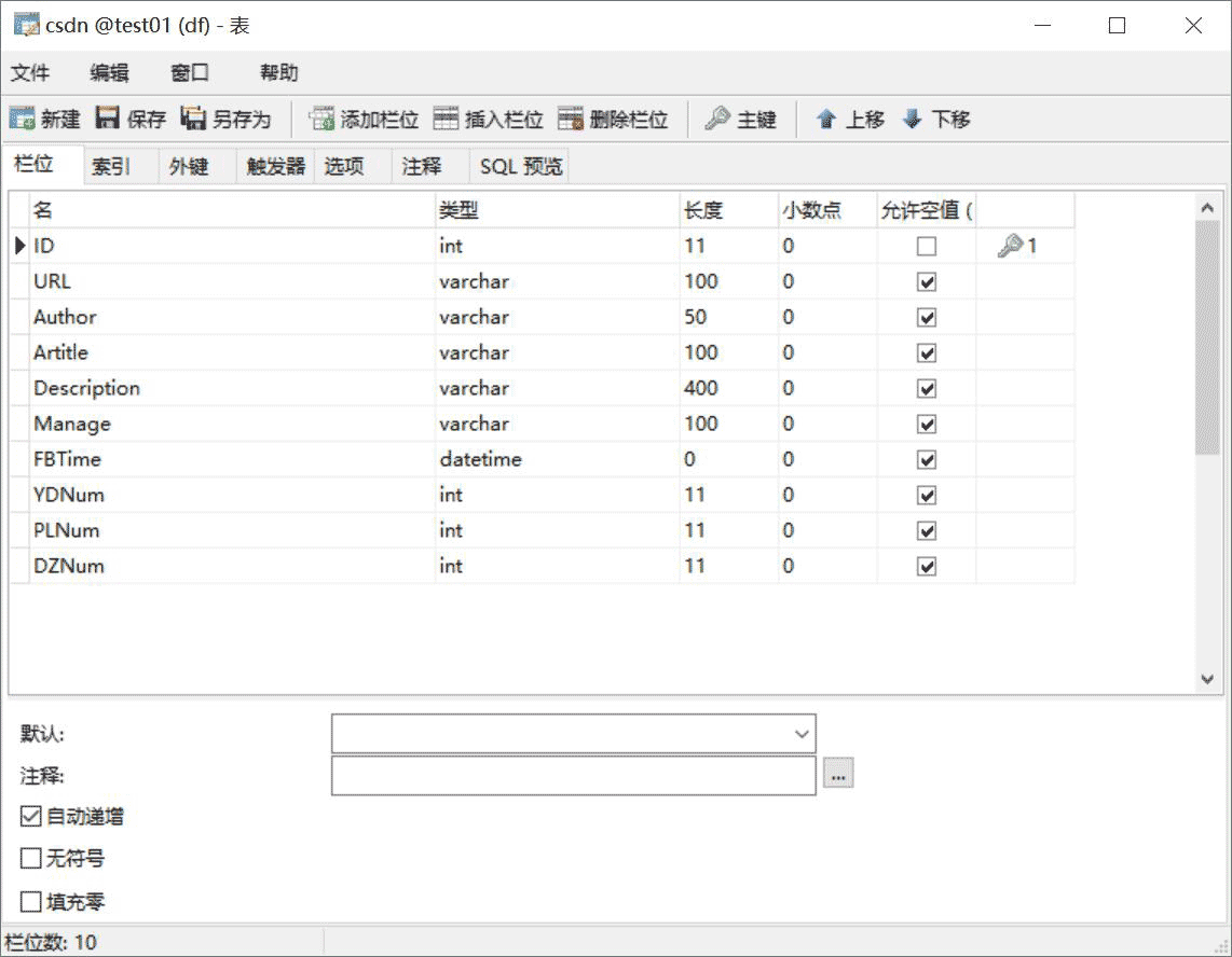CREATE TABLE `csdn` ( `ID` int(11) NOT NULL AUTO_INCREMENT, `URL` varchar(100) COLLATE utf8_bin DEFAULT NULL, `Author` varchar(50) COLLATE utf8_bin DEFAULT NULL COMMENT '作者', `Artitle` varchar(100) COLLATE utf8_bin DEFAULT NULL COMMENT '标题', `Description` varchar(400) COLLATE utf8_bin DEFAULT NULL COMMENT '摘要', `Manage` varchar(100) COLLATE utf8_bin DEFAULT NULL COMMENT '信息', `FBTime` datetime DEFAULT NULL COMMENT '发布日期', `YDNum` int(11) DEFAULT NULL COMMENT '阅读数', `PLNum` int(11) DEFAULT NULL COMMENT '评论数', `DZNum` int(11) DEFAULT NULL COMMENT '点赞数', PRIMARY KEY (`ID`) ) ENGINE=InnoDB AUTO_INCREMENT=9371 DEFAULT CHARSET=utf8 COLLATE=utf8_bin;