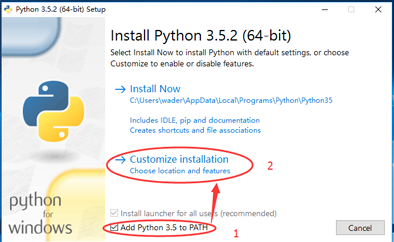 此处选择自定义安装,因为要修改默认安装位置。另外这里勾选了 "Add Python 3.5 to PATH" 选项,会自动配置环境变量,而python 2.x 需要我们手动配置,这个下面说。